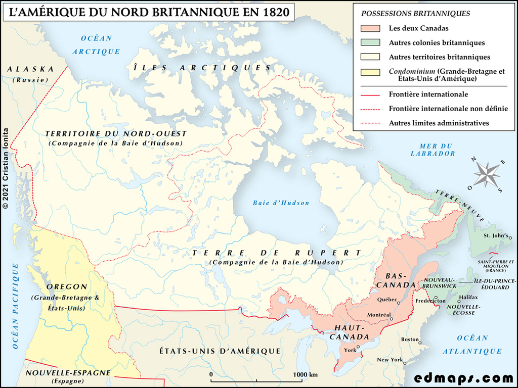 En 1820, l'Amérique du Nord britannique se compose de plusieurs colonies distinctes s'étendant de l'Atlantique aux confins occidentaux inexplorés, formant un ensemble territorial vaste mais fragmenté administrativement.