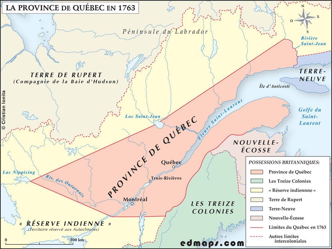 Le territoire de la nouvelle province se limite essentiellement à la vallée du Saint-Laurent, s'étendant de l'île d'Anticosti jusqu'aux environs du lac Ontario. Cette délimitation restreinte exclut délibérément les vastes régions des Grands Lacs et de l'Ohio, désormais classées comme territoires réservés aux Autochtones (« Réserve indienne »). La population totale compte environ 70 000 habitants, dont près de 65 000 Canadiens français catholiques et seulement quelques centaines de nouveaux arrivants britanniques, principalement des marchands et militaires concentrés à Québec et Montréal.